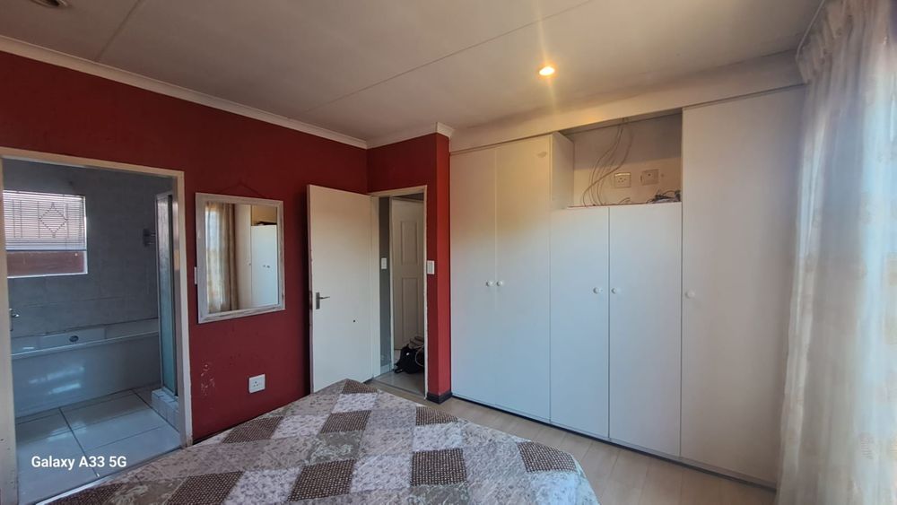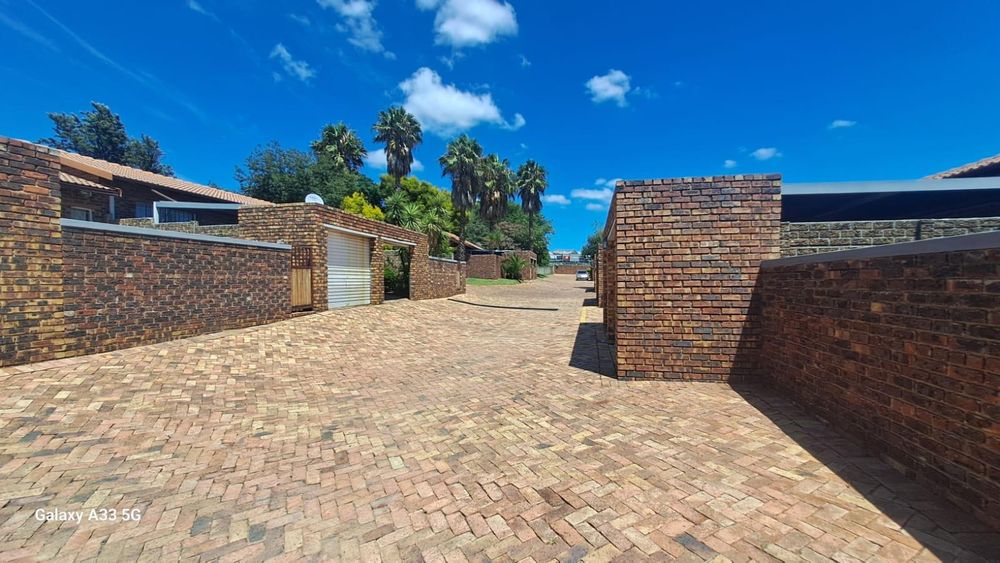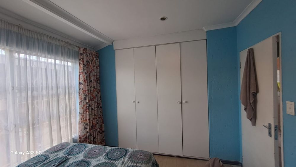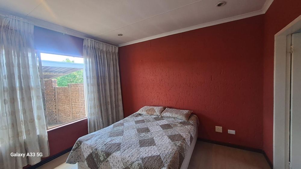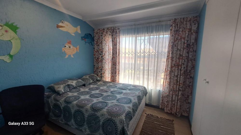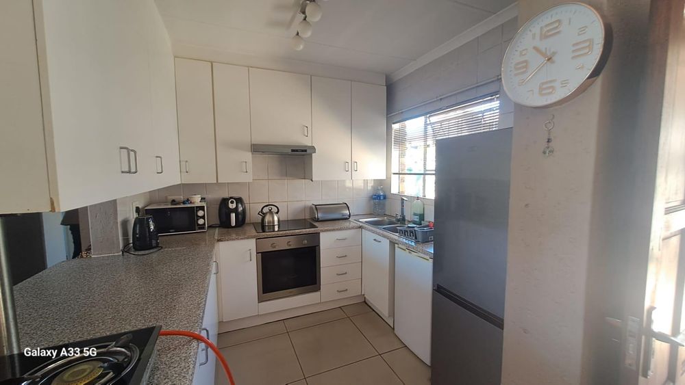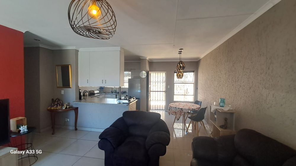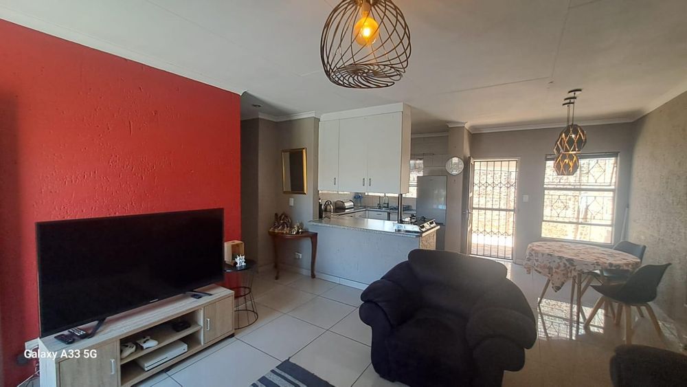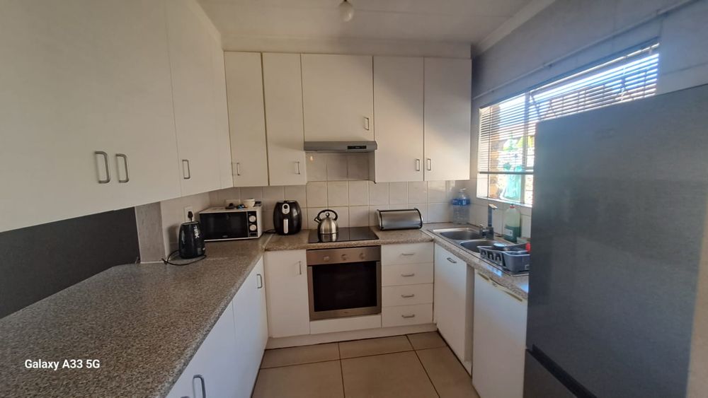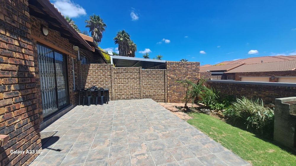 The house offers 3 bedrooms with laminated floors and built-in cupboards, the main-en-suite has a bath, free standing shower, toilet and basin. The family bathroom has a shower/ bath, toilet and basin. The open-plan kitchen has granite tops, lots of cupboards, and electric stove and oven. The living area has enough space for a dining and lounge area. Sliding doors open to a spacious garden and tiled patio area The unit has a double garage.