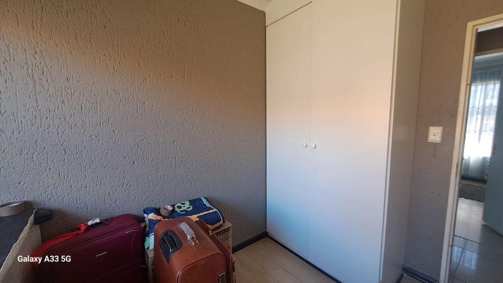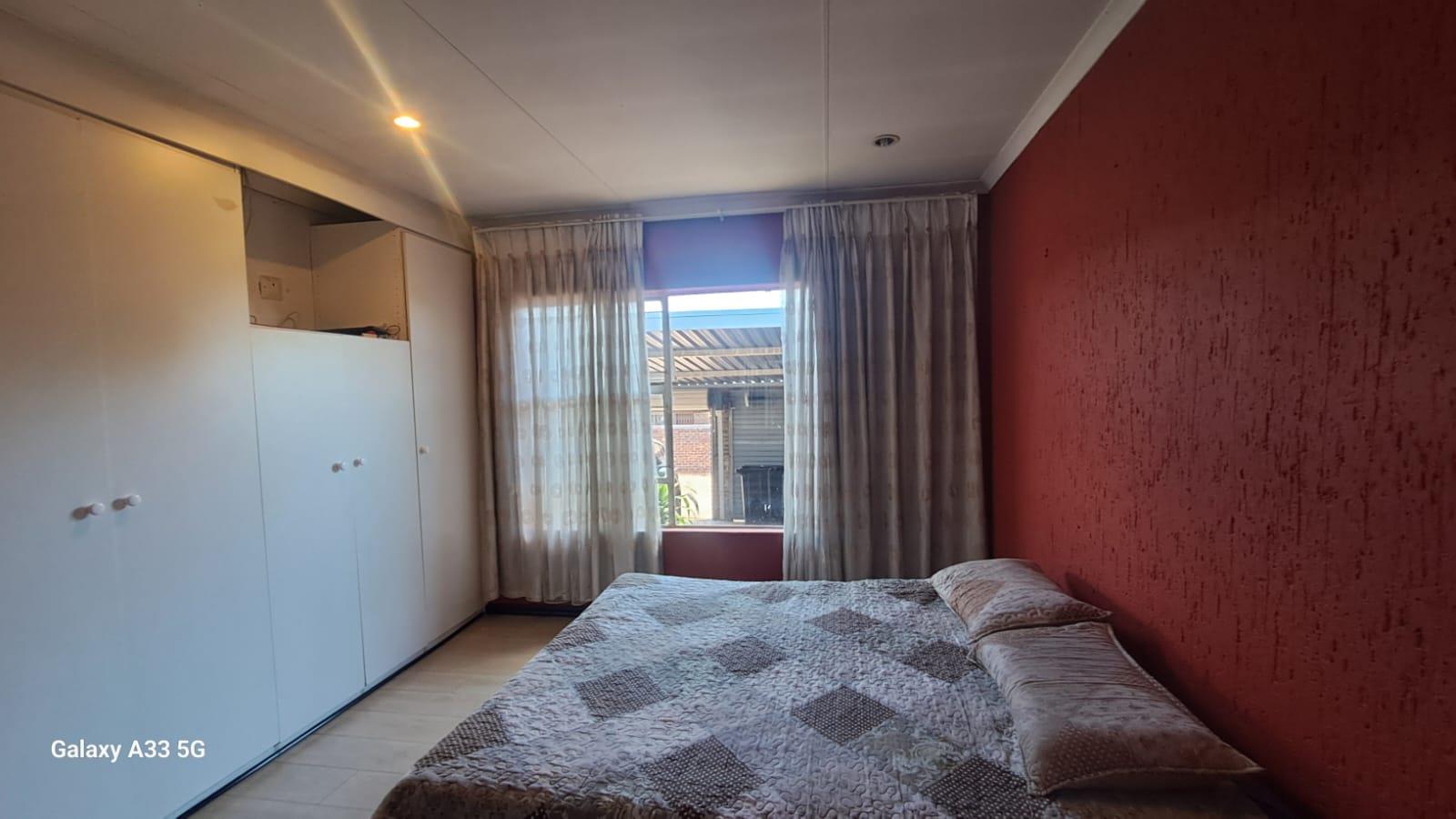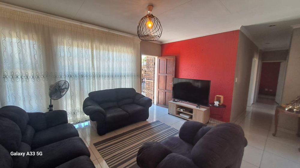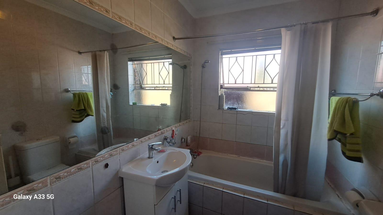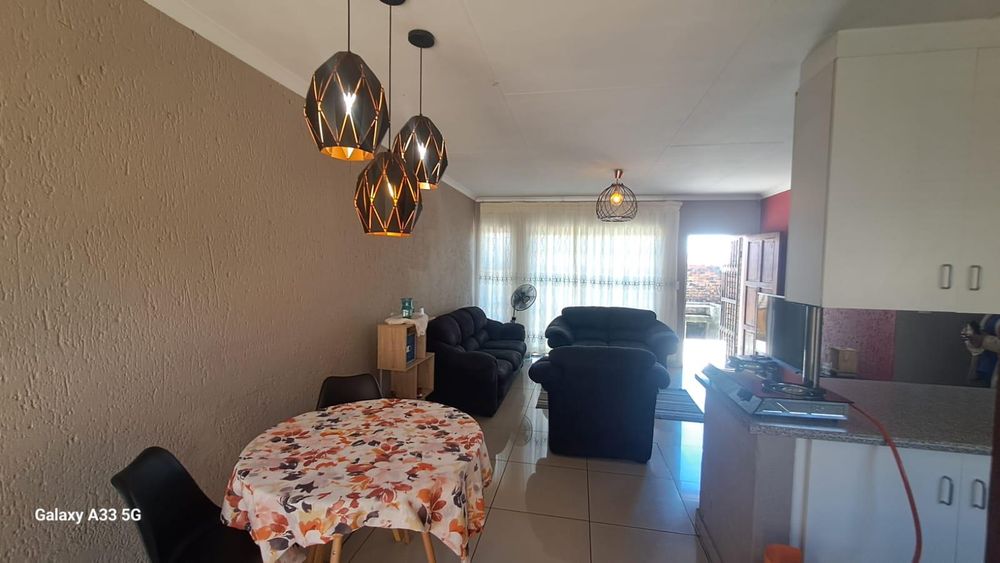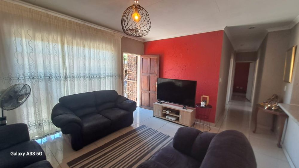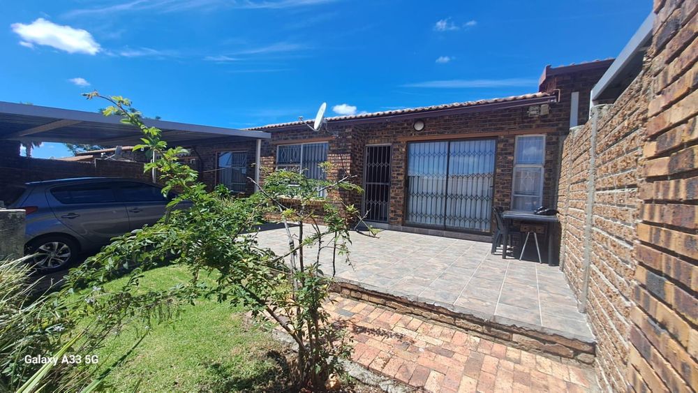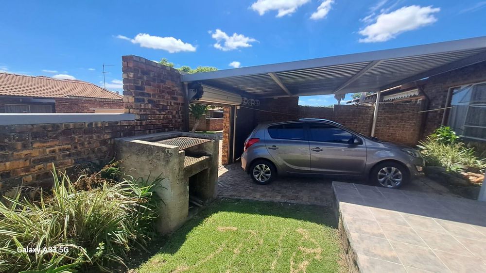 The house offers 3 bedrooms with laminated floors and built-in cupboards, the main-en-suite has a bath, free standing shower, toilet and basin. The family bathroom has a shower/ bath, toilet and basin. The open-plan kitchen has granite tops, lots of cupboards, and electric stove and oven. The living area has enough space for a dining and lounge area. Sliding doors open to a spacious garden and tiled patio area The unit has a double garage.