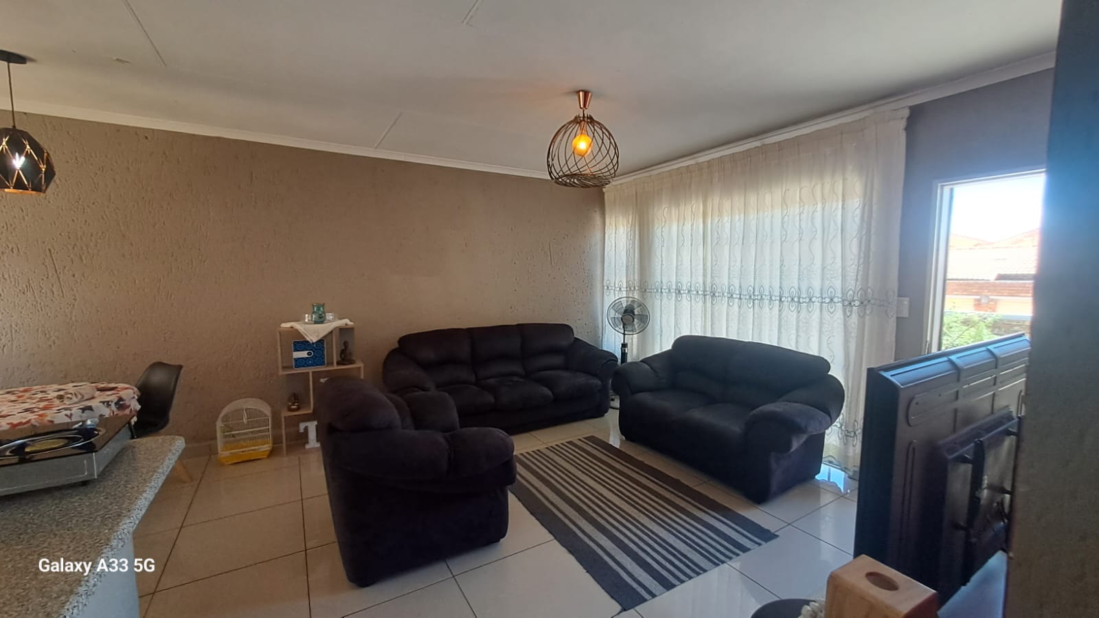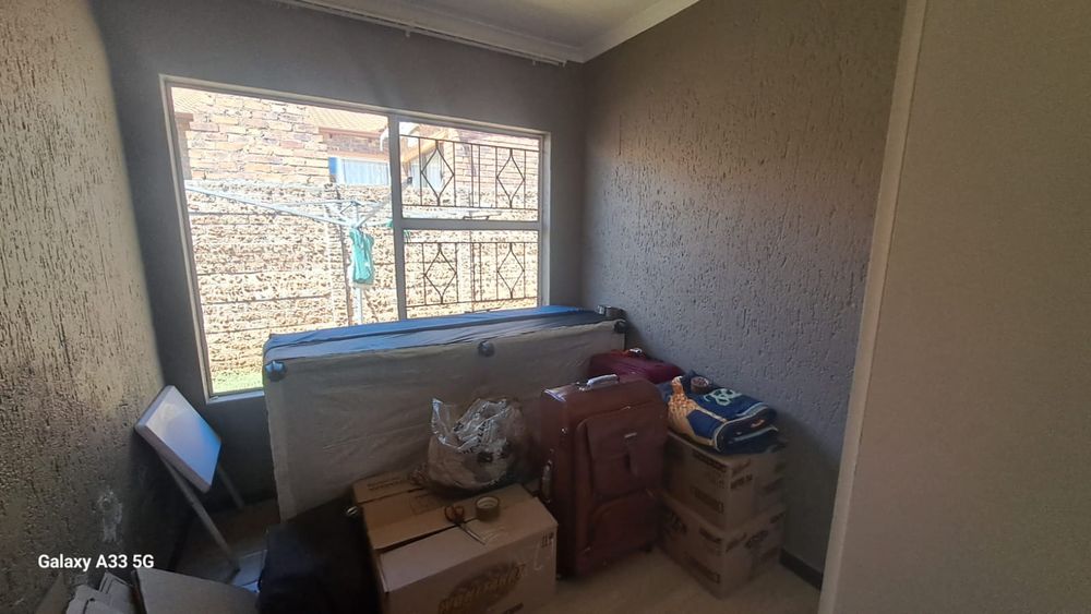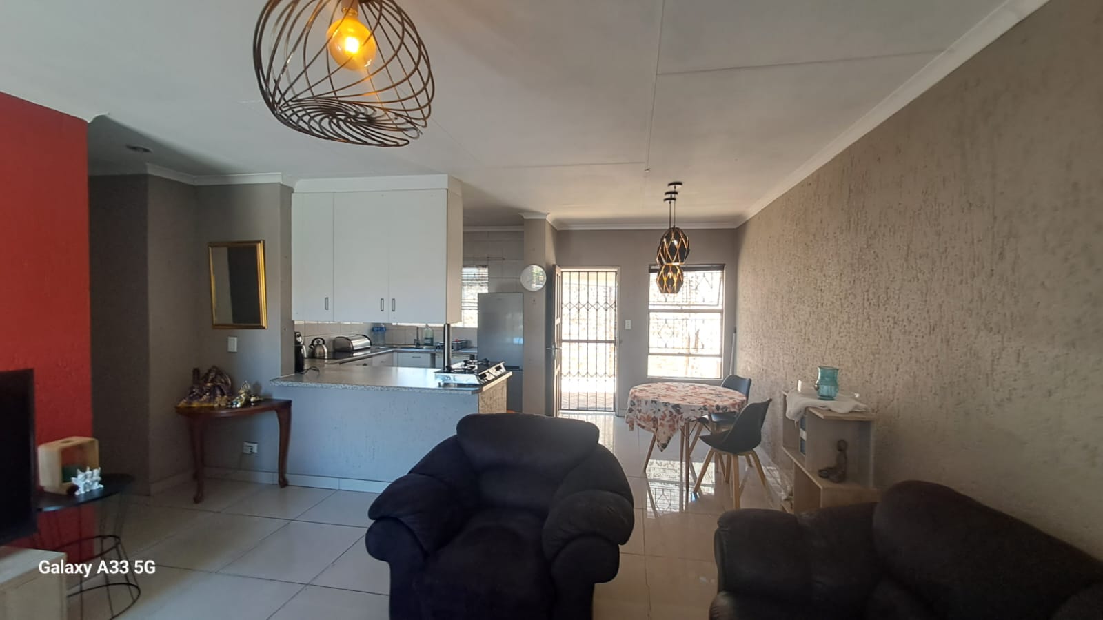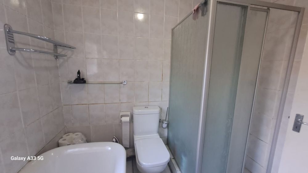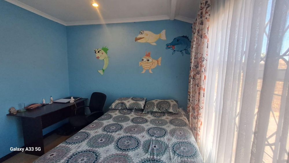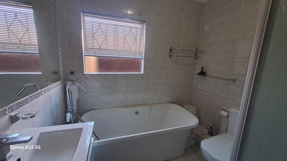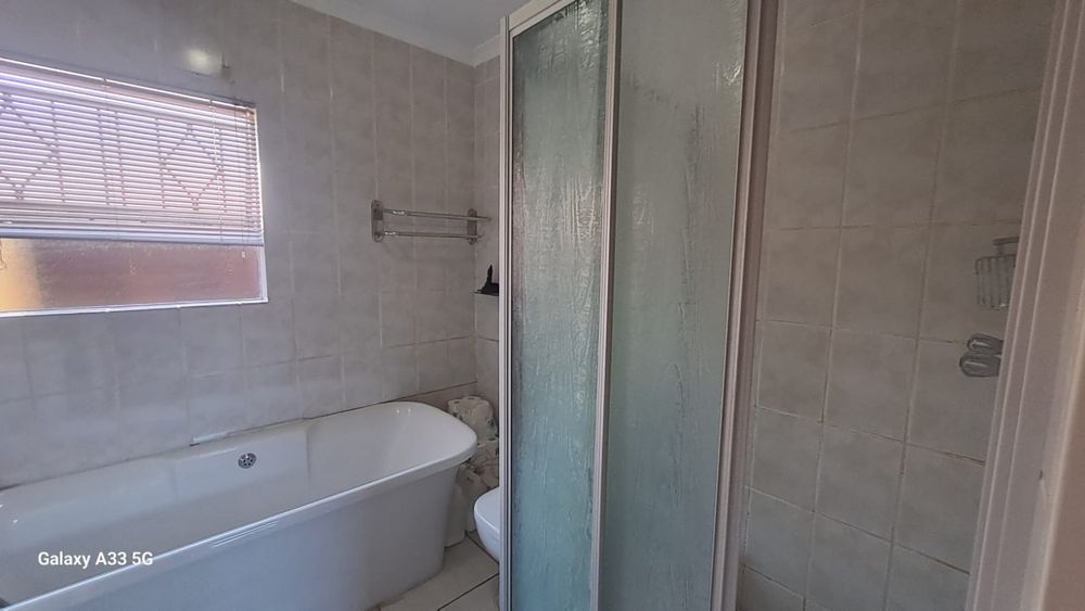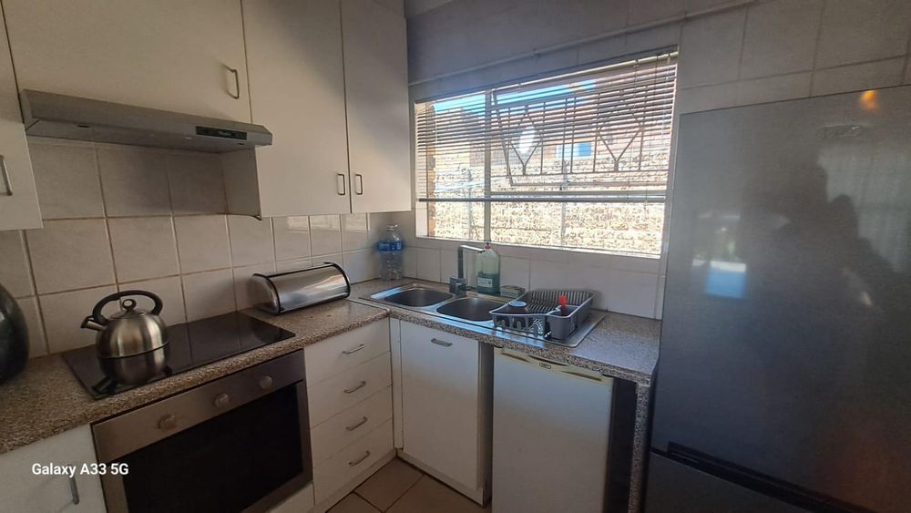 The house offers 3 bedrooms with laminated floors and built-in cupboards, the main-en-suite has a bath, free standing shower, toilet and basin. The family bathroom has a shower/ bath, toilet and basin. The open-plan kitchen has granite tops, lots of cupboards, and electric stove and oven. The living area has enough space for a dining and lounge area. Sliding doors open to a spacious garden and tiled patio area The unit has a double garage.