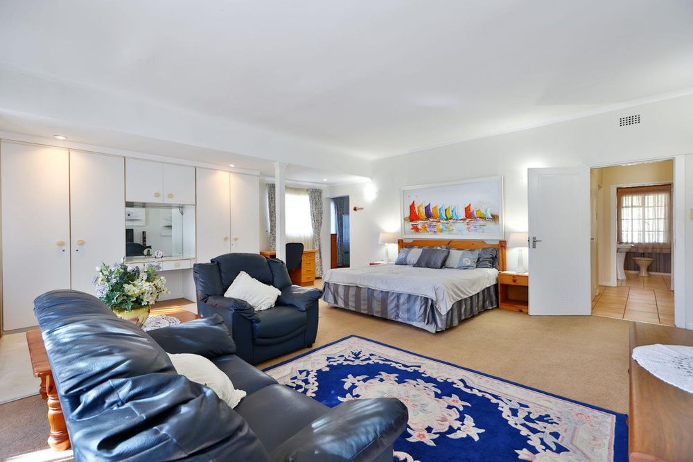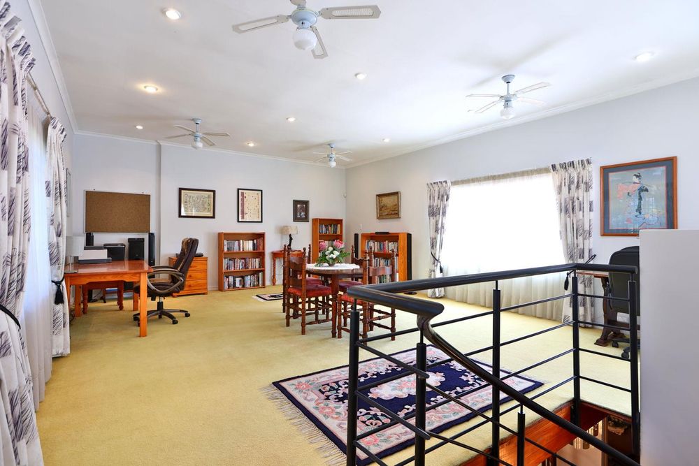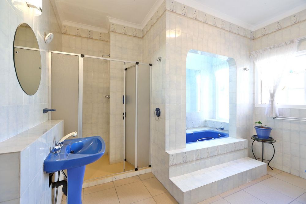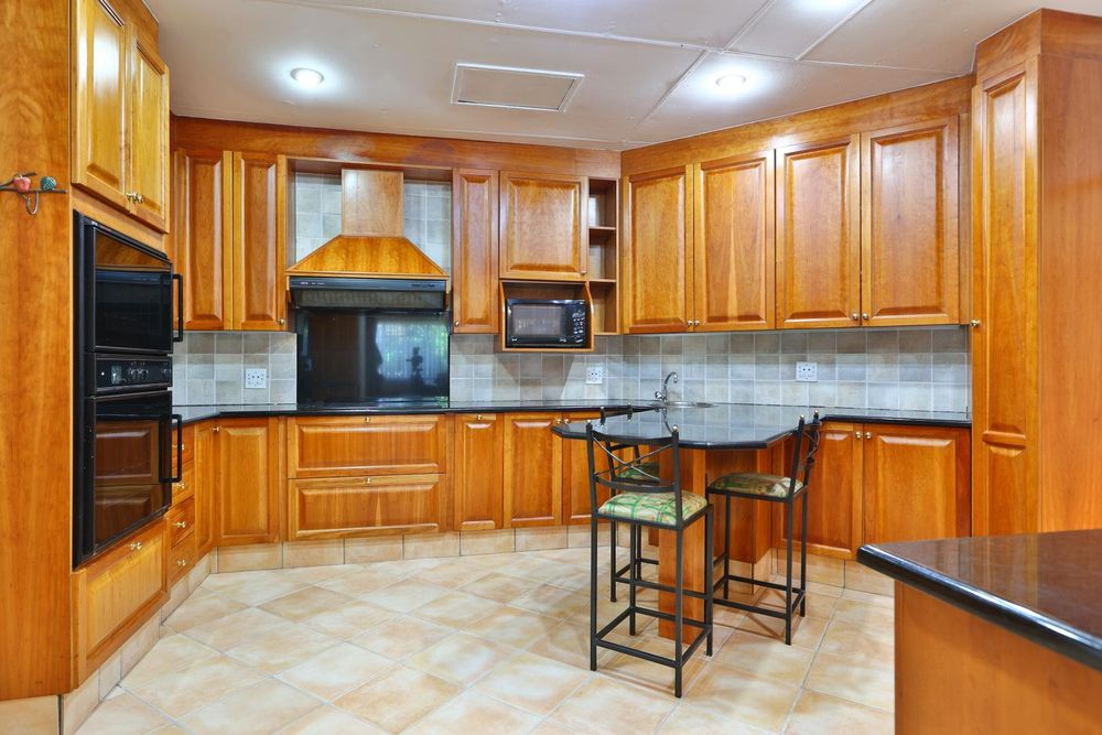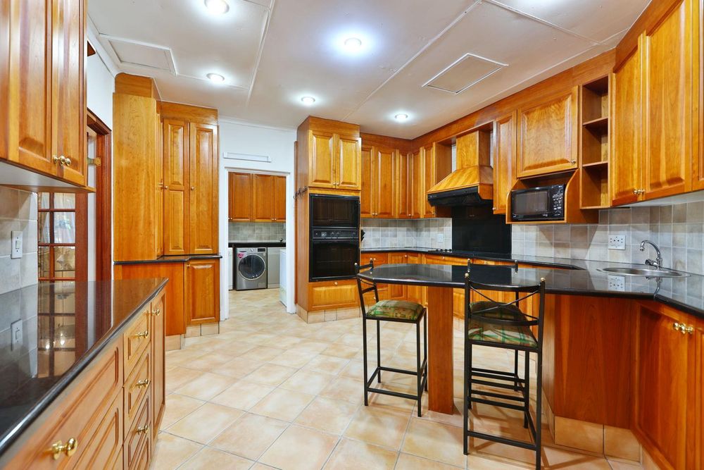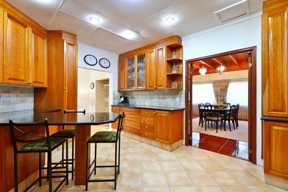 Enter through the main door into a spacious foyer and turn left into the large formal lounge with a big study leading from it. Both these rooms open onto a smaller patio with a security gate. To the right is the very big family lounge which flows effortlessly to the chef’s kitchen with a breakfast bar, electric hob, extractor fan, double eye-level oven, black granite tops and ample cupboards. If you feel like enjoying the outside, the family lounge also spills out onto the extra size covered patio with 4 ceiling fans overlooking the beautiful pool.