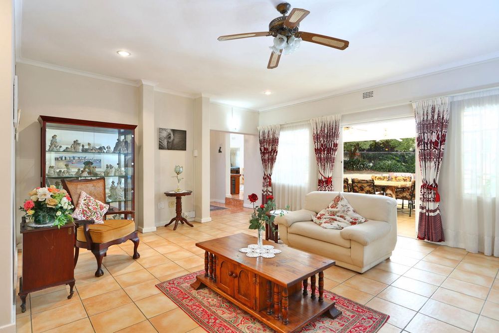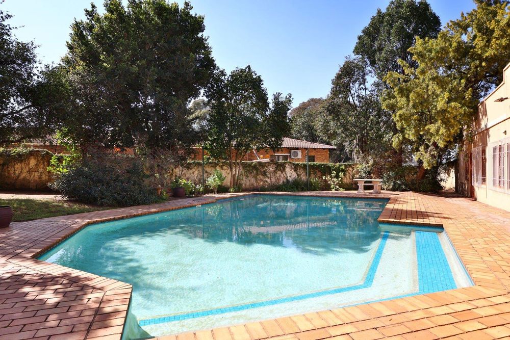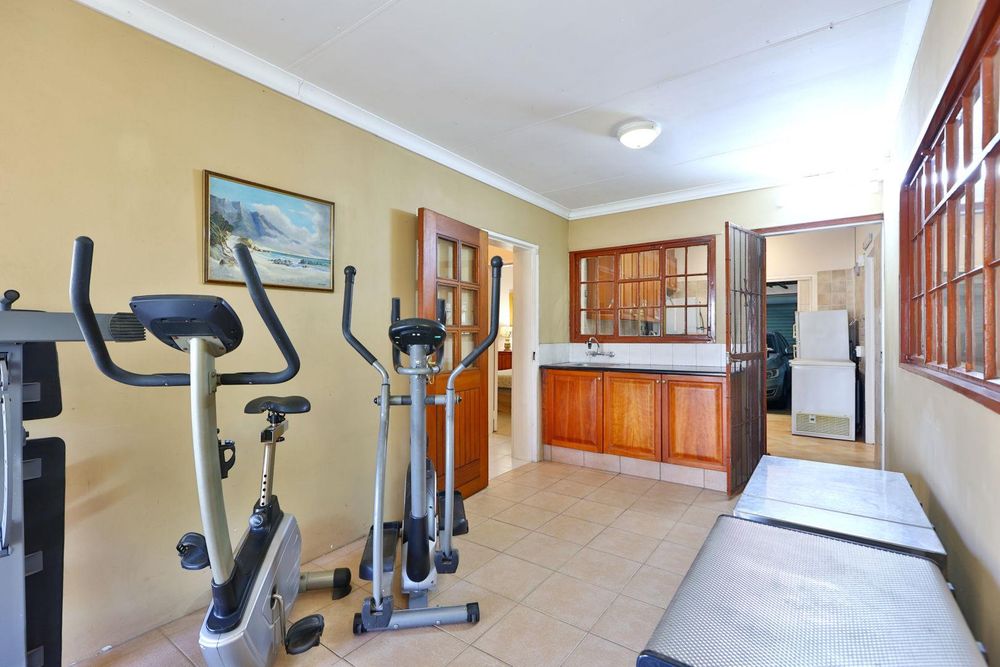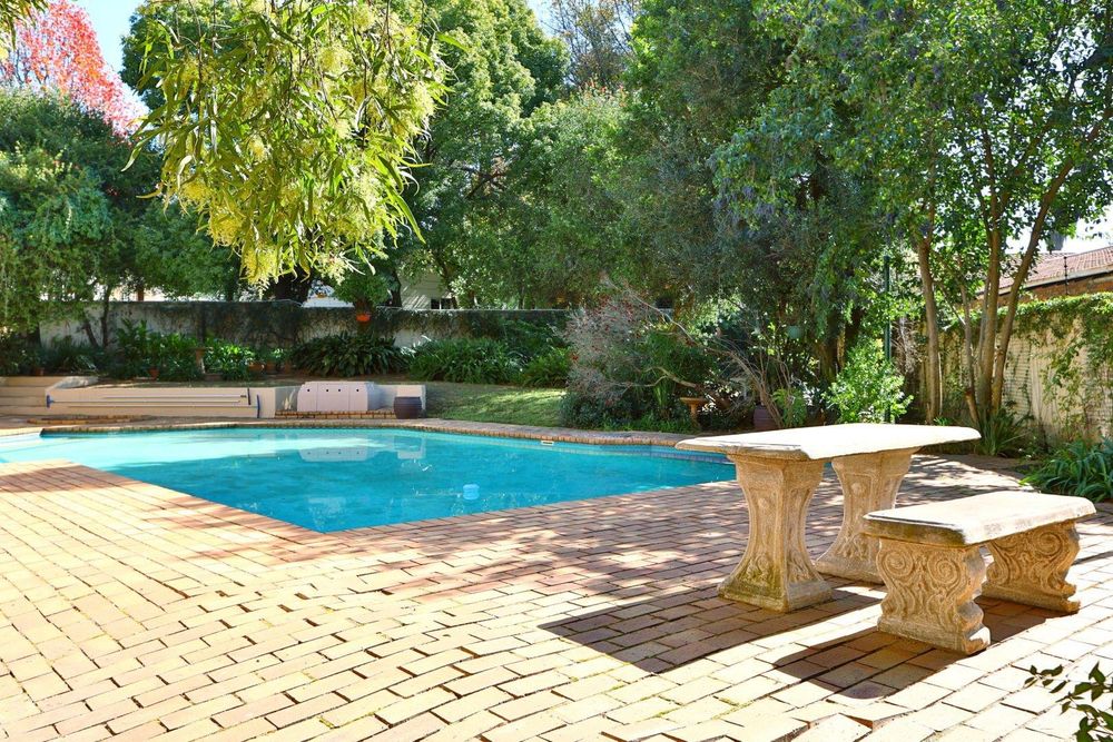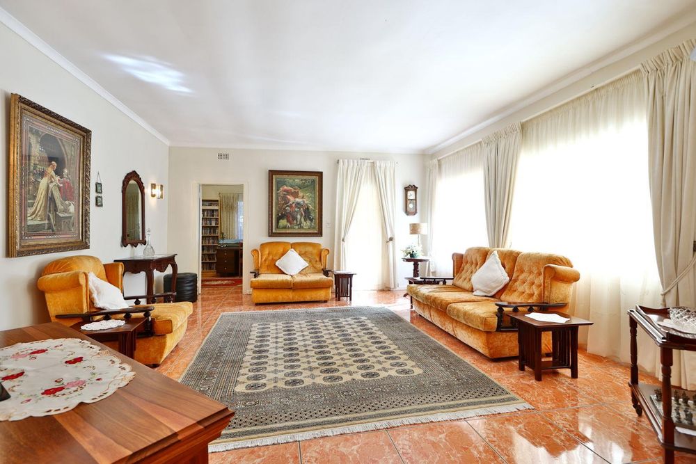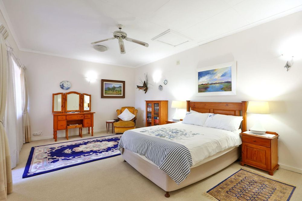 Enter through the main door into a spacious foyer and turn left into the large formal lounge with a big study leading from it. Both these rooms open onto a smaller patio with a security gate. To the right is the very big family lounge which flows effortlessly to the chef’s kitchen with a breakfast bar, electric hob, extractor fan, double eye-level oven, black granite tops and ample cupboards. If you feel like enjoying the outside, the family lounge also spills out onto the extra size covered patio with 4 ceiling fans overlooking the beautiful pool.